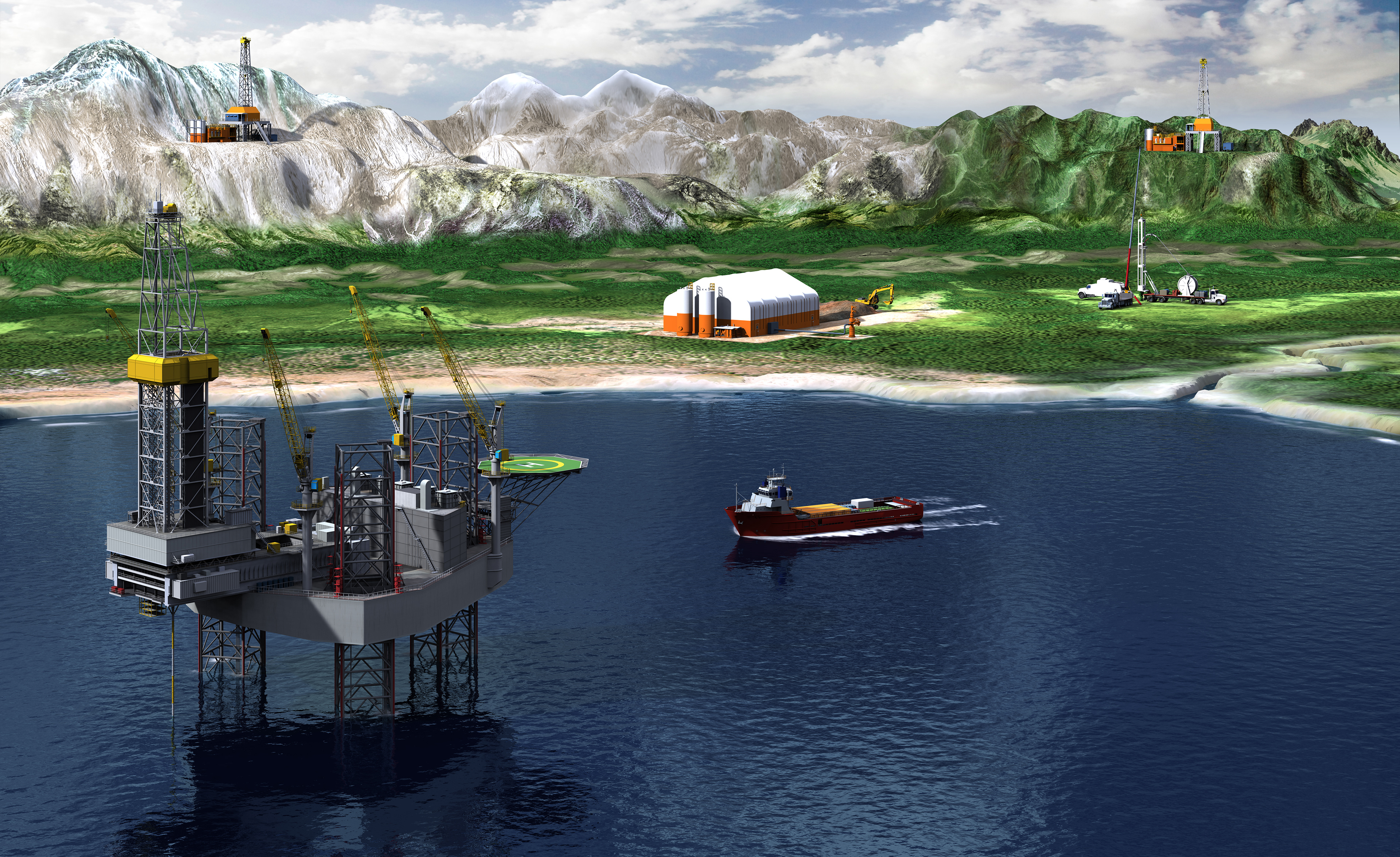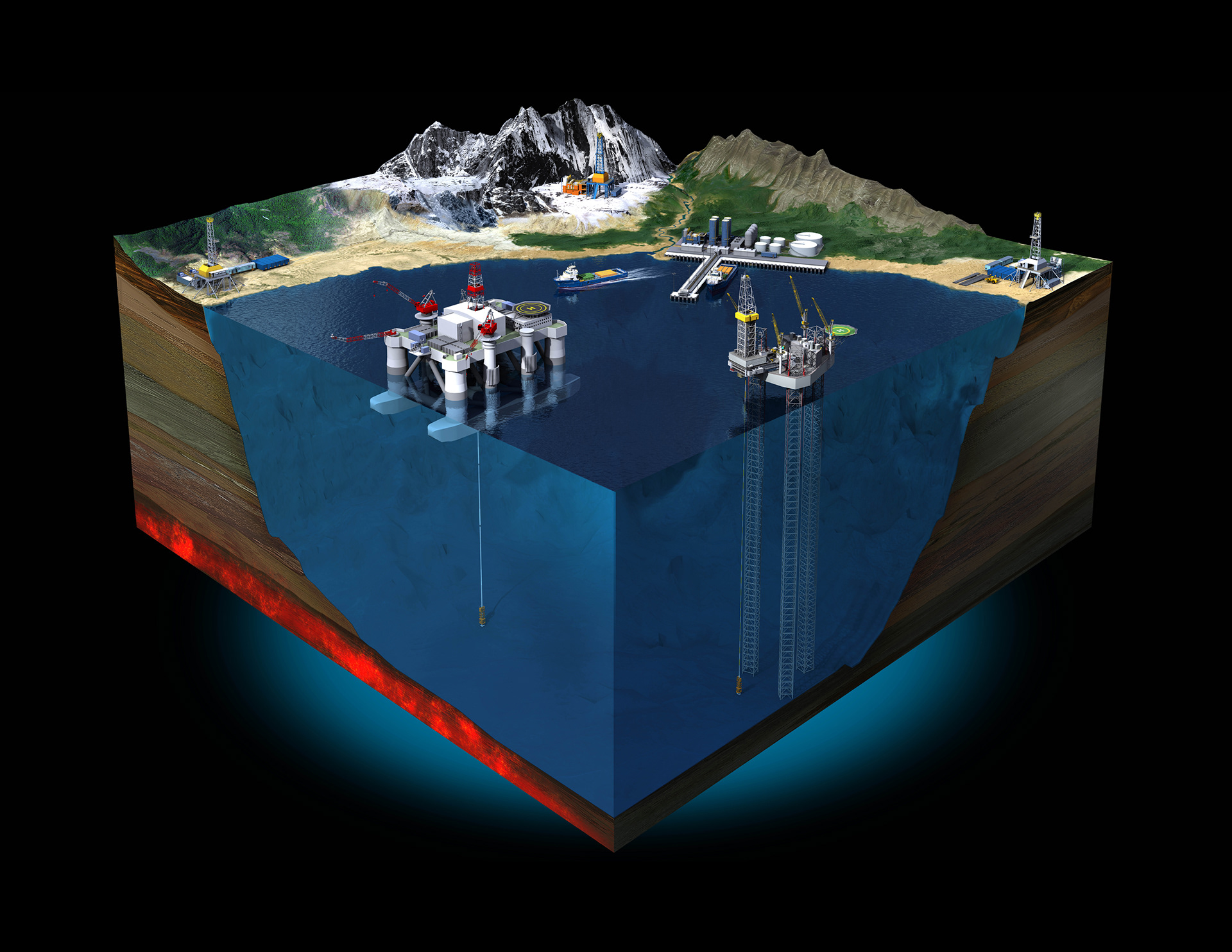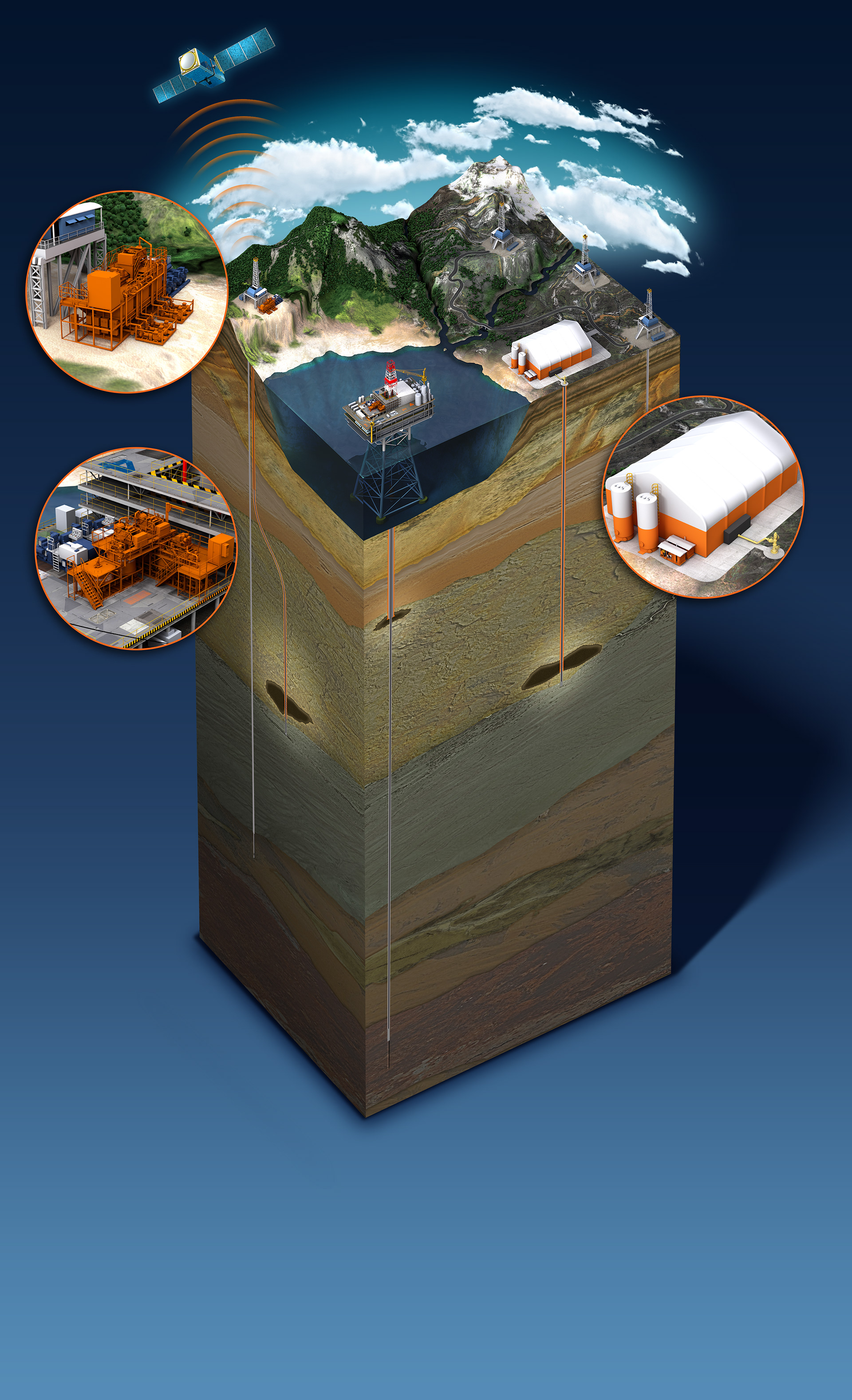 This illustration was created for a very large display to illustrate the different methods to clean and dispose of cuttings created during the drilling of an oil and gas well. These cuttings are often toxic and pose a risk to the environment. This company provides services and products intended to mitigate environmental impact and dispose of the cleaned cuttings deep underground where they pose no threat. The additional illustrations were created for print collateral that accompanied the exibit.