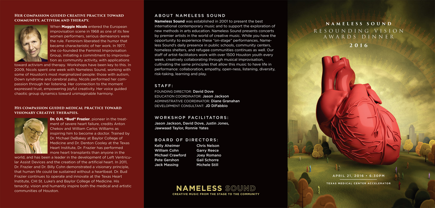 This illustration was created for the cover of a fundraising gala invitation for Nameless Sound, a Houston-based nonprofit whose mission is to bring culturally significant music to inner-city children. The event honored both a renowned musician for her work as an improvisational artist, and an a Houston heart specialist who has been a generous benefactor for this organization.